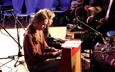 Ein besonderer Moment des Abends war der Toy-Piano-Minimal-Music-Beitrag „Ronald! Play the Toy“ dreier Schüler*innen des Gymnasiums. Präsentiert wurde das Ergebnis eines Workshops mit Radke vom 21. November, in dem zu musikalischen Ausdrucksformen im politischen Kontext geforscht und zwei Minimal-Kompositionen entwickelt worden waren. Die simultane malerische Gestaltung verwandelte den Auftritt in ein eindrucksvolles Multimedia-Erlebnis.