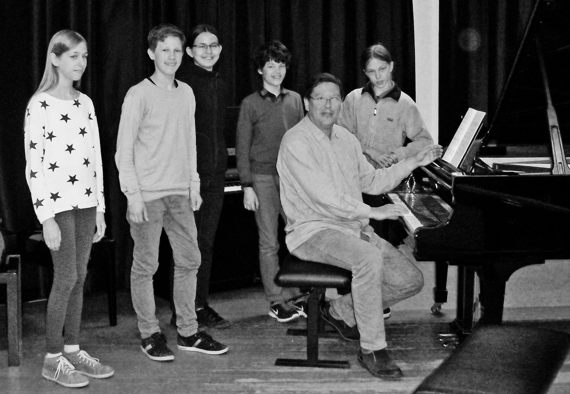 | Charlotte, Daniel, Hannah, Noah, Tjarbe vom Kurs I mit dem Komponisten am Flügel.